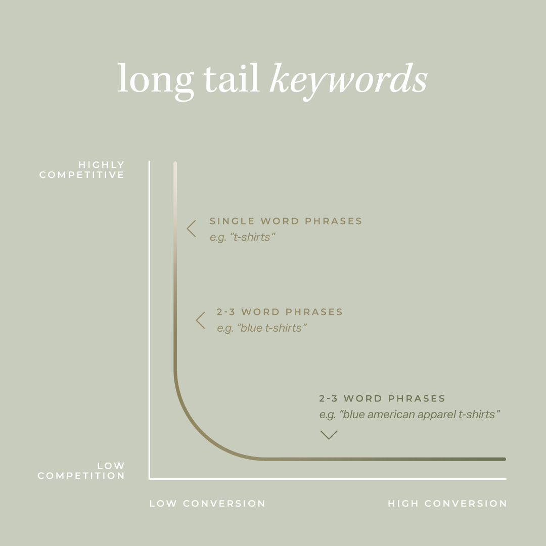 Long tail keywords are a great starting point for SEO as they generally have less competition (due to less search volume) than single word phrases and are therefore easier to rank for.